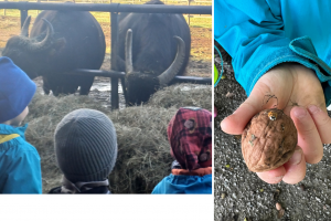 Im Oktober ist Erntezeit! Nach unserer erfolgreichen Kartoffelernte versuchten wir unser Glück bei der Suche nach der schönsten Baumnuss. Dafür wurden wir auf den Büffelhof nach Beuerbach eingeladen. Zunächst hatten wir das große Glück, den Büffeln bei Ihrem Frühstück Gesellschaft leisten zu dürfen! Ein spannendes Ereignis, welches jedem Fernseher große Konkurrenz bietet. Zwar freuten wir uns über den strahlenden Sonnenschein, aber die eisigen Temperaturen zwangen uns zum raschen Beginn unserer Ernte. Es polterte und polterte in den Eimerchen, Nuss für Nuss wanderte in unseren Besitz. Viele Kinder suchten emsig und unermüdlich, andere Kinder zogen es schon bald vor, die Suche durch das Spiel zu ersetzen. Dennoch waren wir zusammen wiederum sehr erfolgreich! Ein längerer Spaziergang entlang des großartigen Geländes ließ uns so manche Herbstfrucht entdecken. Hungrig erreichten wir den Standort und nahmen endlich unsere wohlverdiente Brotzeit ein. Gesättigt machten wir uns nochmals auf zur Erkundung der Gegend und entdeckten neben den Pferden, auch noch 2 Schafe. Nunmehr war jedes Kind angehalten, sein Eimerchen nochmals zu füllen und die Ausbeute mit nach Hause zu nehmen.