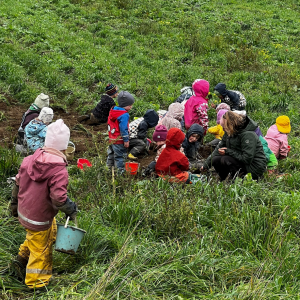 Es war wieder soweit – die junge Erntebrigade des Waldkindergartens Kaufering rückte aus zur Ernte der Kartoffeln. In diesem Jahr stellte uns Herr Laber ein Stück seines Bio-Kartoffel-Ackers in Pürgen zur Verfügung. Der Treffpunkt war für den Spielplatz in Pürgen geplant. Überraschend wurde exakt in unserer Erntewoche dort eine Baustelle eröffnet. Dies tat unserer Euphorie jedoch keinen Abbruch. Wir nutzten das kleine Stück Spielplatz, was nicht eingezäunt war, als Treffpunkt, was sich als völlig ausreichend herausstellte. Ein großer Dank geht an Familie Kübel, die dem Kindergarten einen Bollerwagen spendierte und auch an Familie Pezzei für das zur Verfügung-Stellen eines weiteren Bollerwagens. Beide Wägen wurden mit den Rucksäcken, Eimern und Schaufeln bepackt, so dass unsere 20 Kinder beim Marsch zum Acker nicht so schwer tragen mussten. Das Laufen entlang der Straße gelang unserer jungen Gruppe ganz wunderbar und voller Tatendrang erreichten wir das Kartoffelfeld. Rasch wurde der Erntebereich abgesteckt und schon die ersten Buddelversuche ließen laute Jubelrufe erklingen. Ob mit oder ohne Unterstützung – fast alle Kinder beteiligten sich bis zum Schluss sehr eifrig bei der Ernte. Die reichhaltige Ernte wird in den nächsten Wochen im Kindergarten verkocht. Unsere diesjährige größte Kartoffel fand Ellie. Der stolze Kartoffelkönig hatte ein Gewicht von 450 Gramm und wurde im Kindergarten königlich gekrönt.