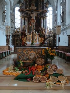 Am Montag, den 6. Oktober, marschierten wir zum Ernte Dank Altar in die Kirche Str. Johannes Baptist. Dort erwartete uns ein bunt gedecktes Allerlei. Die Kinder bestaunten (und berührten) Getreide, Obst, Gemüse und lernten eine Vielzahl an neuen Sorten kennen! Warum feiern wir Ernte-Dank ? - war eine der spannenden Fragen am Altar. Zum Abschluss sprachen wir in der Kirche ein Dankgebet. Anschließend ging‘s wieder zurück zum Spielplatz, der schon freudig erseht wurde! Ein wunderbarer Ausflug! Die Kinder sind tapfer gelaufen!